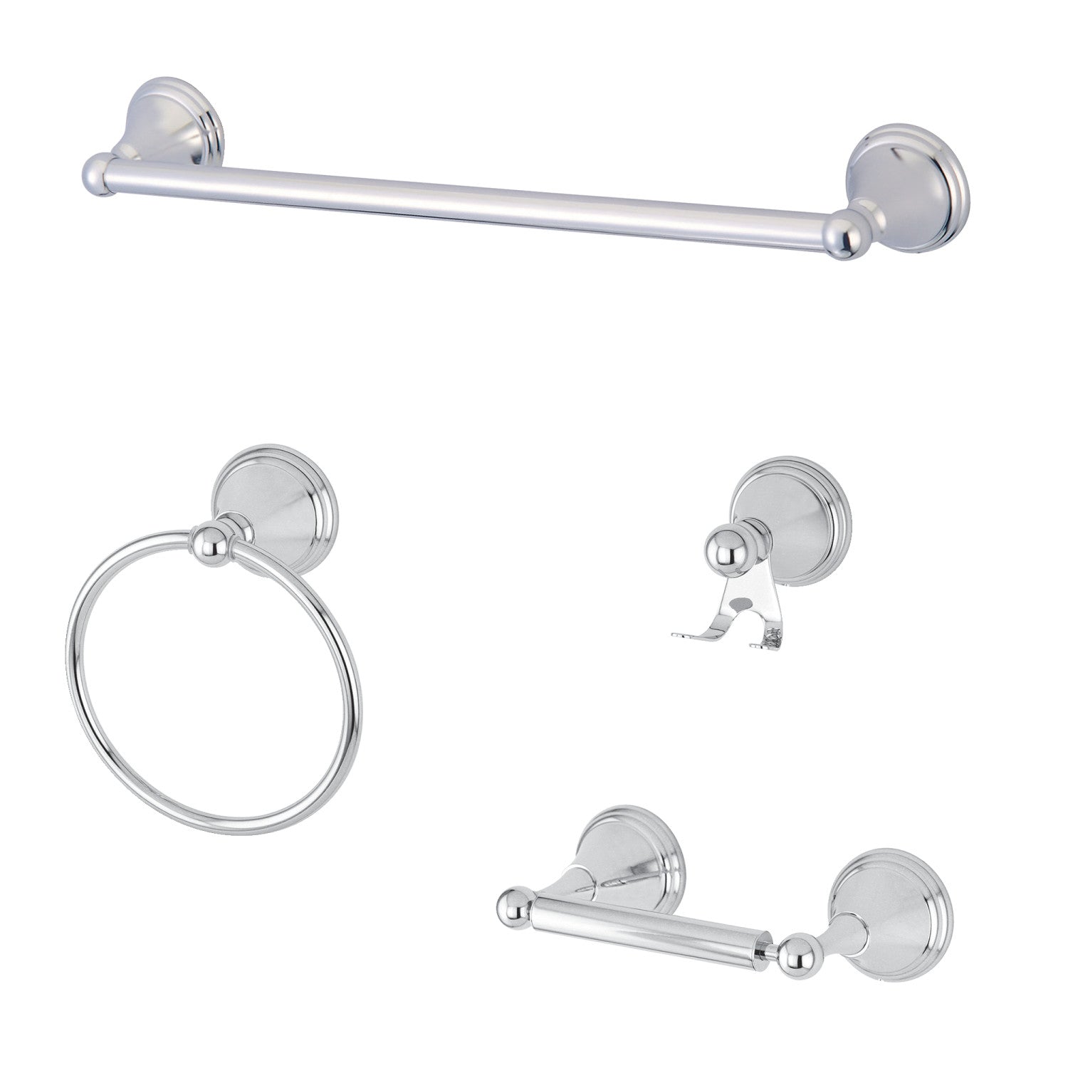• 4-piece set includes: 24′ towel bar, towel ring, robe hook, and toilet paper holder